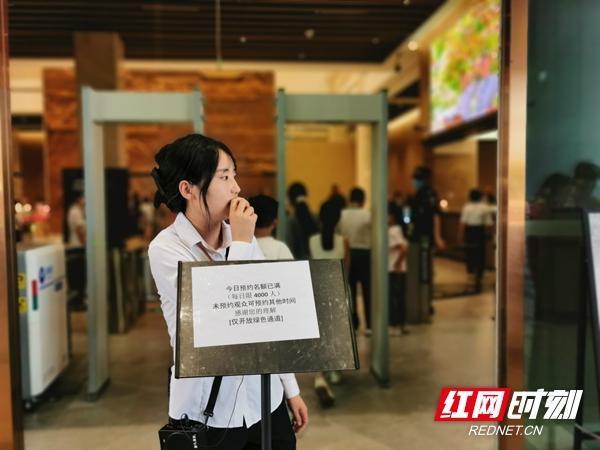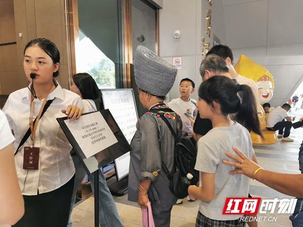 工作人员正在怀化市博物馆(新馆)入口处告知游客入馆信息。(张强 摄)开馆不到一个月,怀化市博物馆(新馆)已经成为怀化热门游览目的地。特别是节假日期间,这里更是人气爆棚,一票难求。“国庆中秋长假期间,我们每天通过官方微信公众号对外发放4000个预约名额,10月1日-5日已全部约满。”怀化市博物馆工作人员告诉红网时刻新闻记者,8天假期,游客来馆热情高涨,仅10月1日-2日两天,就已接待游客2.04万人次(包含预约游客以及绿色通道免预约游客),日均接待游客人次过万。此外,馆内文创商店日均销售额近万元。